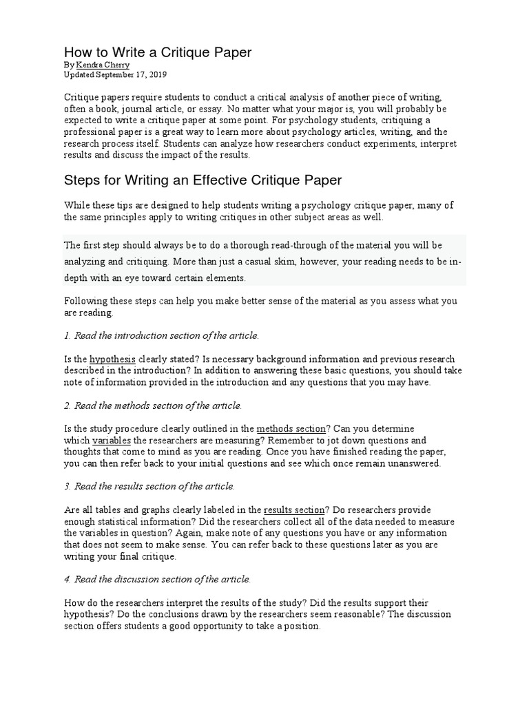 How to critique a research paper. Using our guide with examples, you can write a good article critique essay and you get a perfect mark! Example of critique paper use specific examples to strengthen your critique. Finally, the most favor approach is provided at the end. As critic, you're to pick apart the review paper and outline trouble areas, explaining.